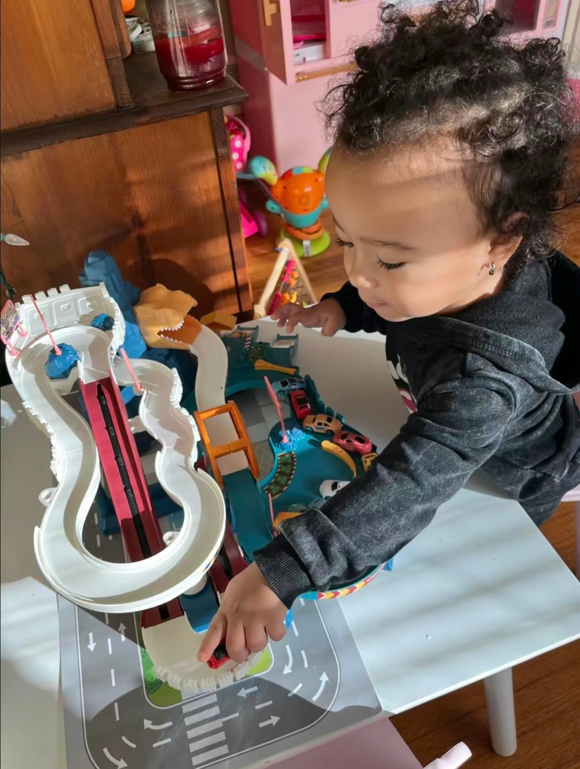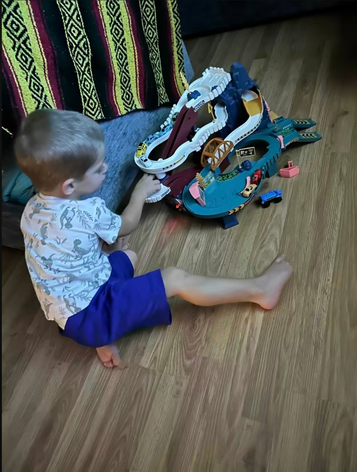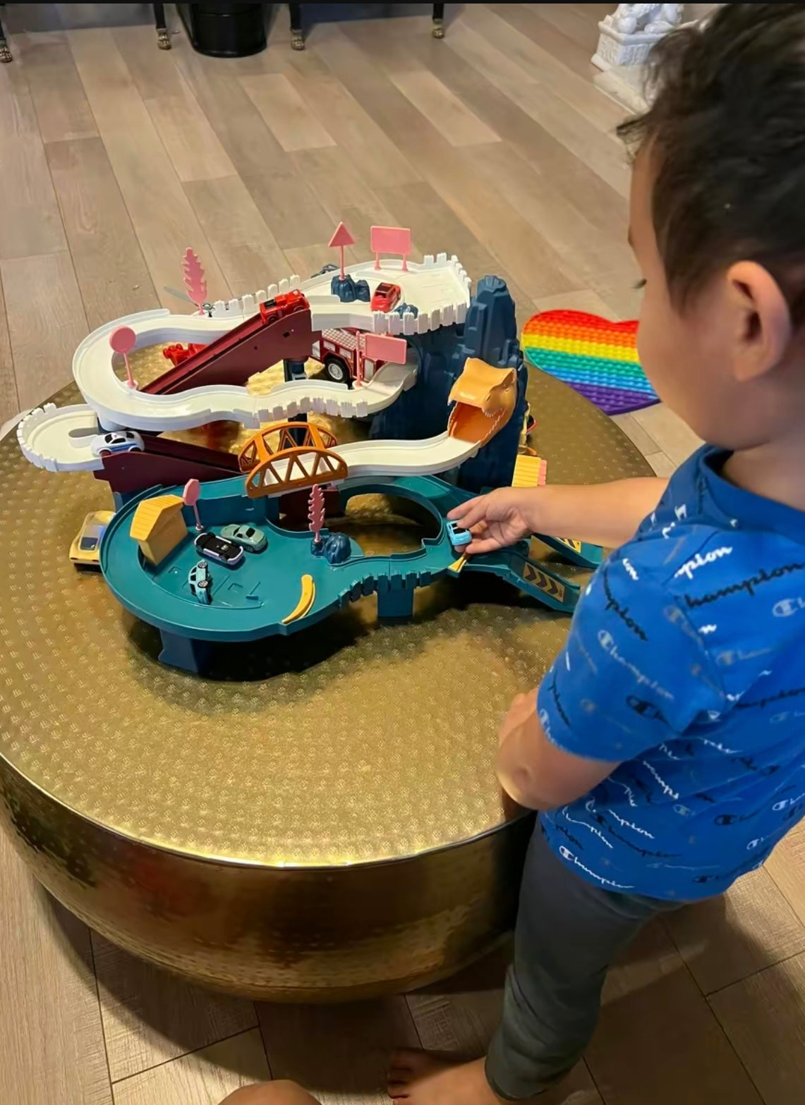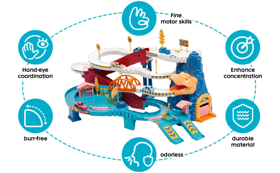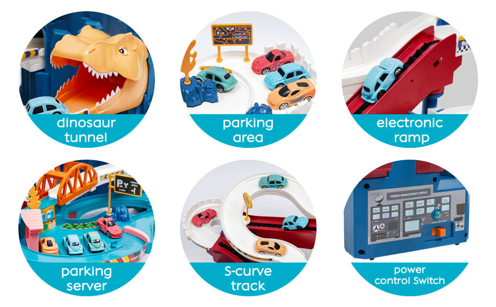 - Dinosaur-themed race track with ramps, tunnels, and parking garages
