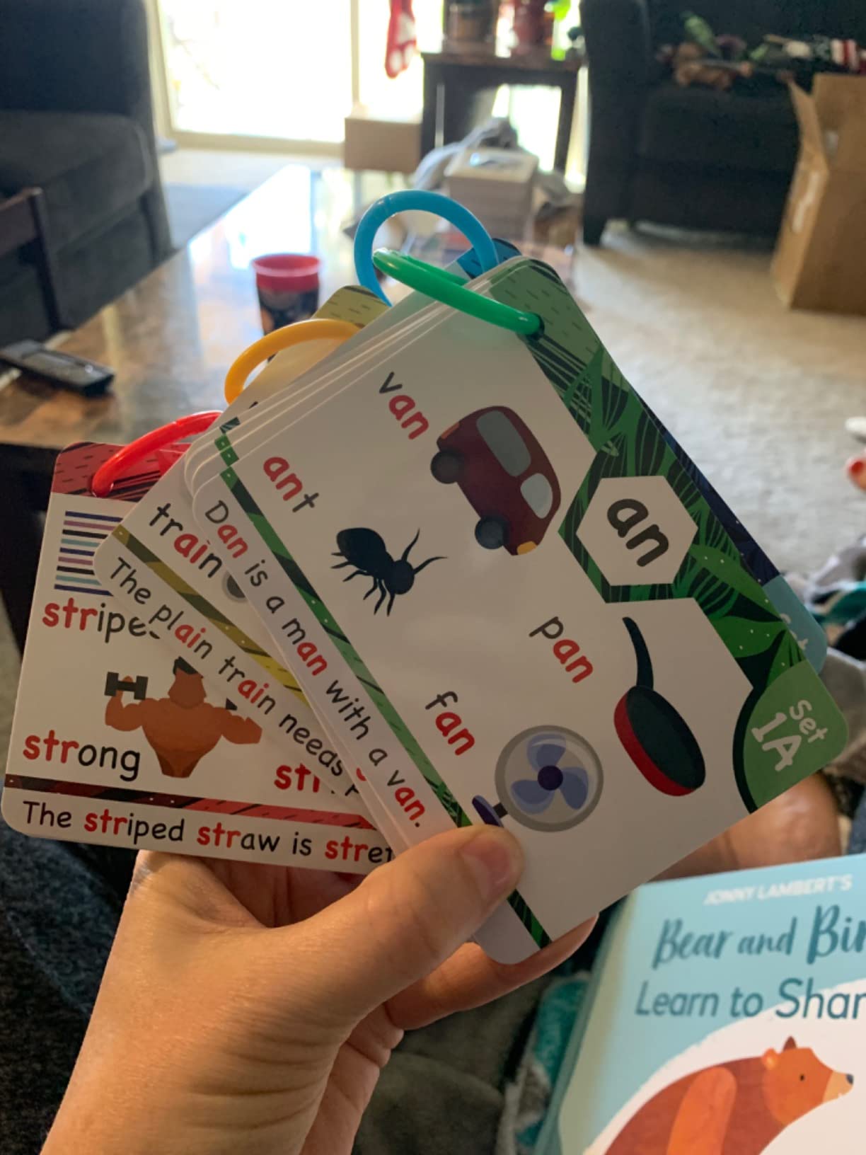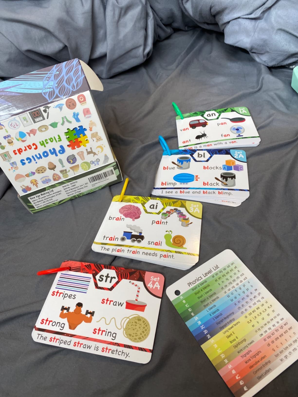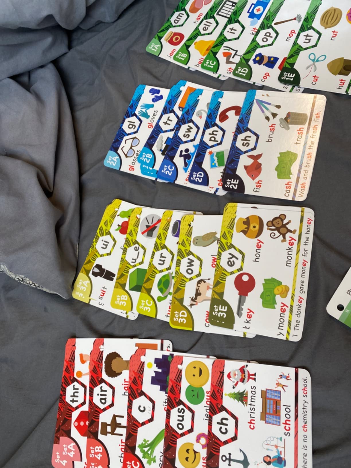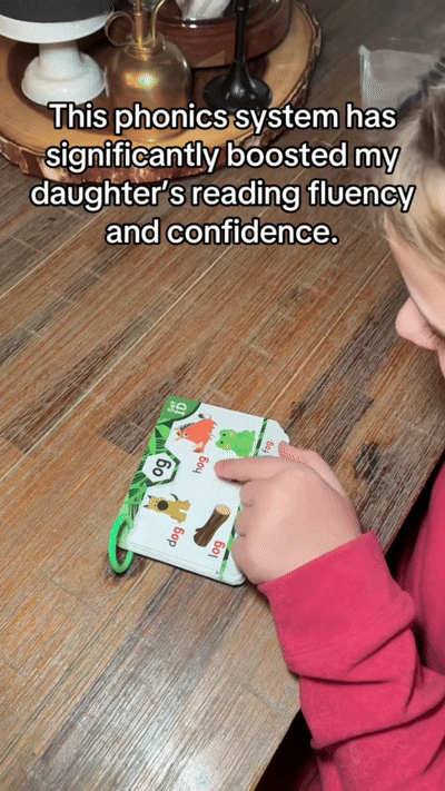 "This phonics set has been a game-changer for my daughter. The flashcards, sorting rings, and pictures make learning fun and interactive. It helped her a ton, improving her reading skills and sparking her love for books. I truly recommend this!"